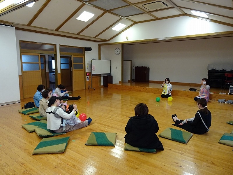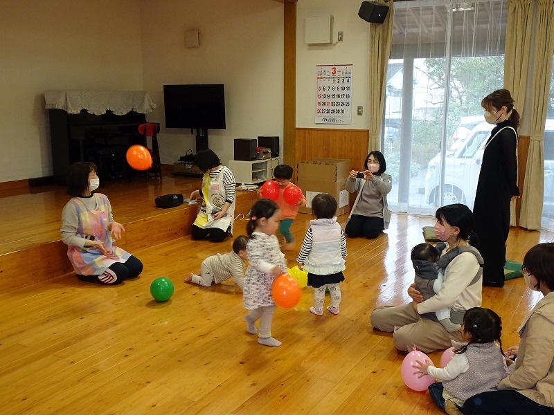 風船を使って遊んだり、音楽に合わせて親子で遊んだりしながら楽しみました♪