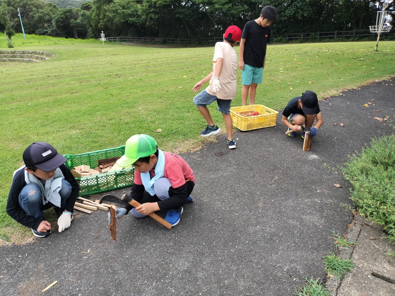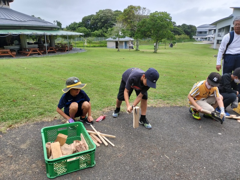 野外炊飯、薪割りの様子です。ナタを使っての薪割り、見ている方がヒヤヒヤします。