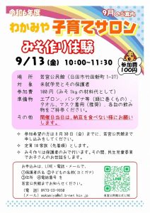 9月の「わかみや子育てサロン」はみそ作り体験です。