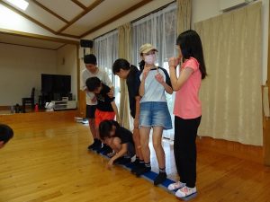 チームに分かれて、平均台の上に乗って、与えられたお題のとおりに