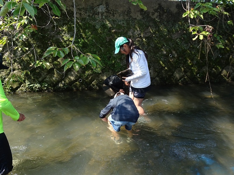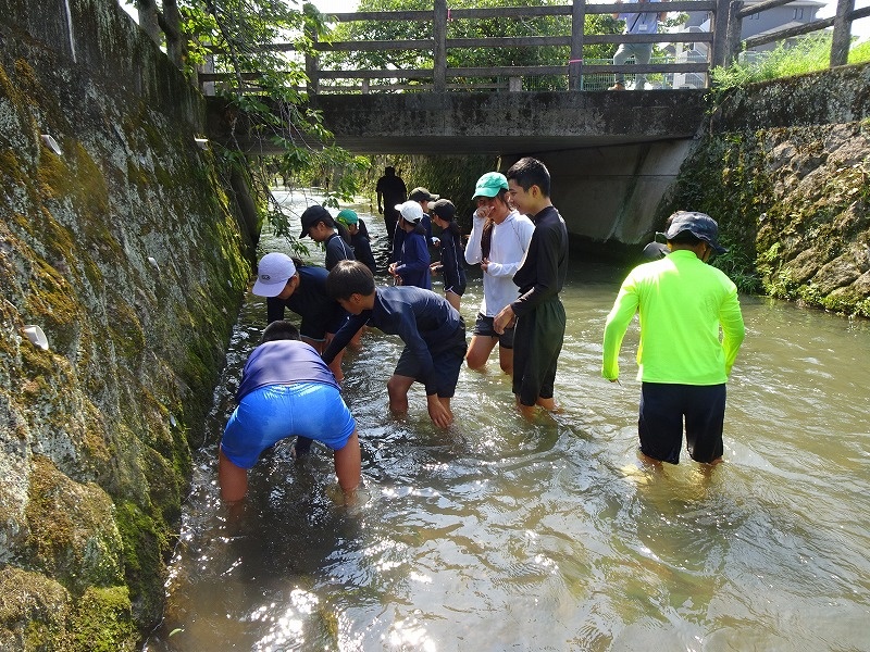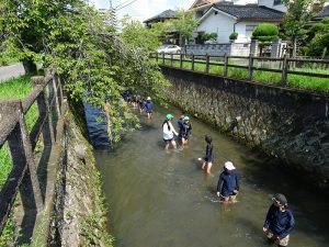 そして、いよいよ、中野川に入り、住んでいる生き物から水質を調査します。。