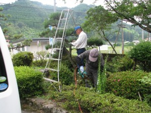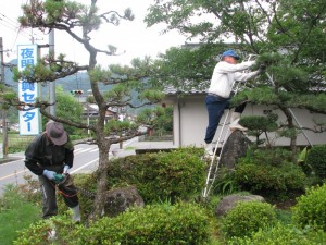 夜明公民館に植えてある松やツツジなどを、ご近所の方にきれいに剪定していただきました。